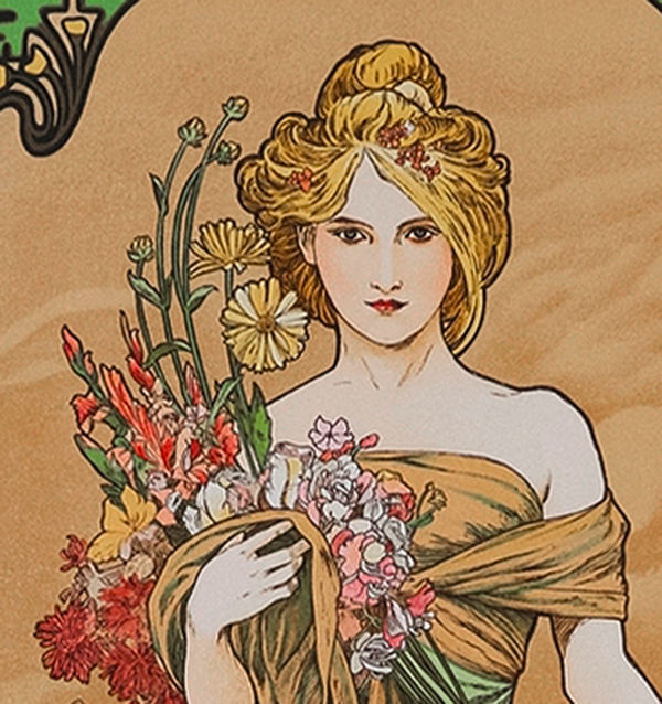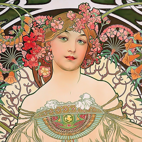 Anfang 1900 gab es eine neue Kunstrichtung, den Jugendstil. Die klassischen Ornamente wurden langsam langweilig und so weckte der Jugendstil einen neuen, frischen, blumigen Lebenstil. Ihr größter Meister war Alphonse Mucha. Schaut selbst.